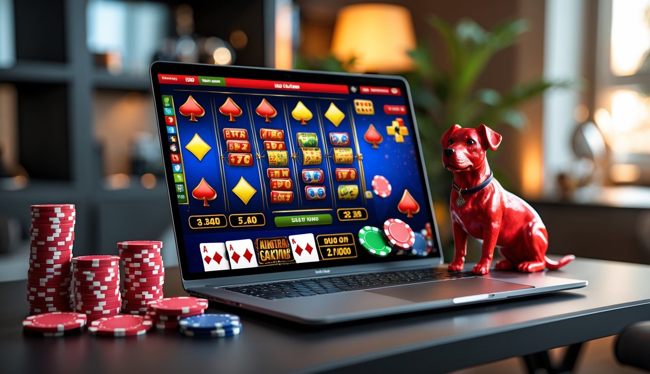 Seorang laptop di atas meja dengan tampilan permainan kasino online dan beberapa chip poker merah serta patung anjing merah di sampingnya.