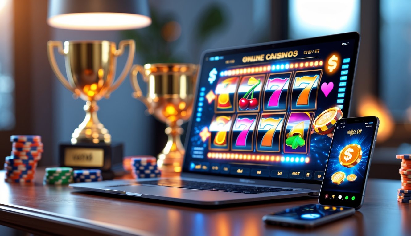 Layar laptop dan ponsel menampilkan permainan slot retro dengan simbol klasik, di atas meja kayu di ruang kerja yang nyaman.